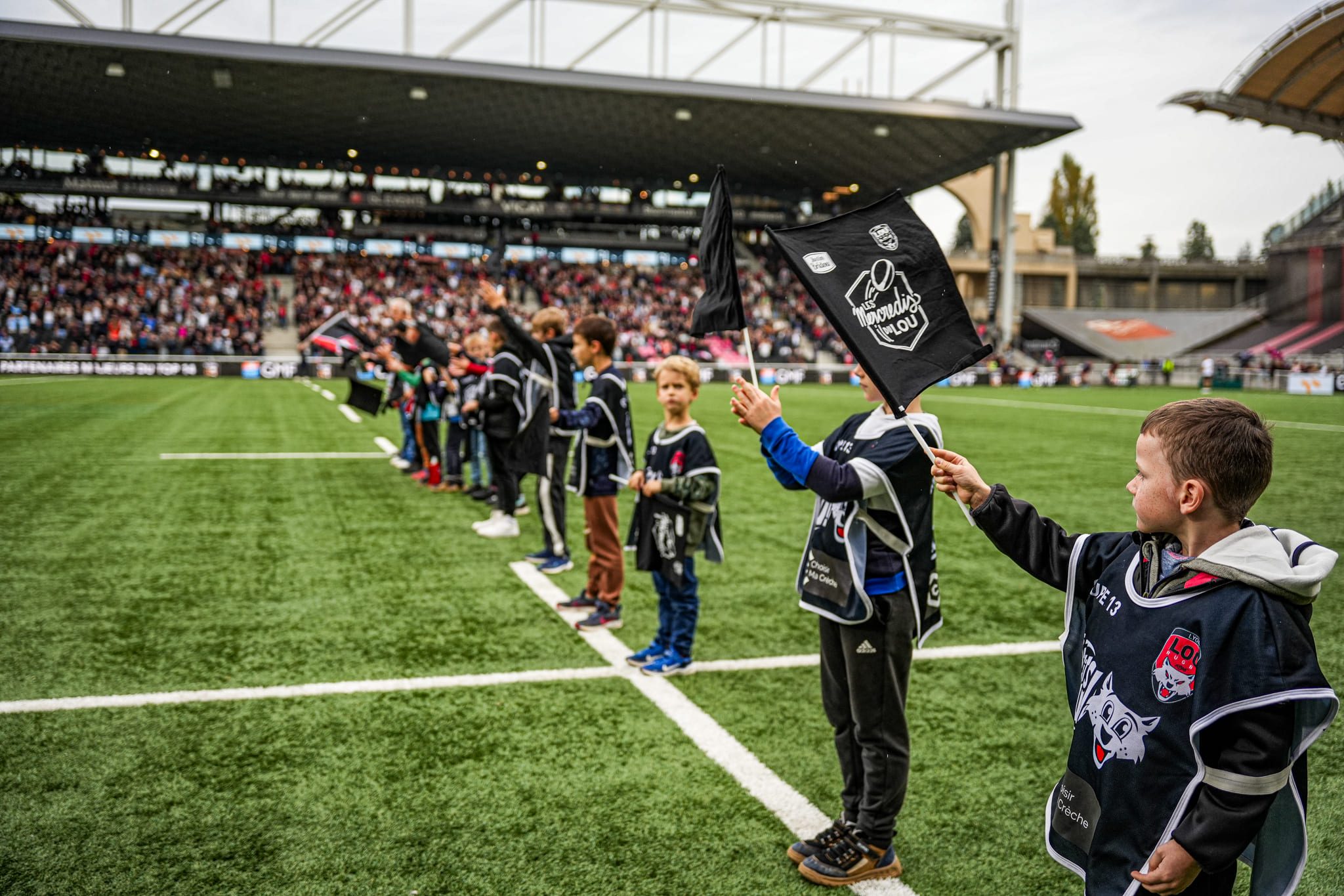 Pendant le match, les p'tits LOU sont positionnés en tribune animée par l'équipe encadrante.